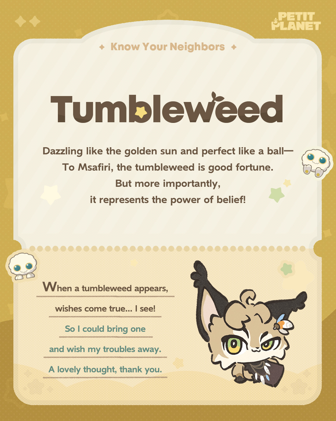 current10:55, 17 April 2026Thumbnail for version as of 10:55, 17 April 20261,080 × 1,350 (963 KB)Shirra (talk | contribs){{File |categories = Official Images;Know Your Neighbors |neighbors = Msafiri |slink1 = https://x.com/PetitPlanetGame/status/2045079823903592732 |slabel1 = Official Petit Planet X (Twitter) |date = 2026-04-17 }} ==Licensing== {{Fairuse}}