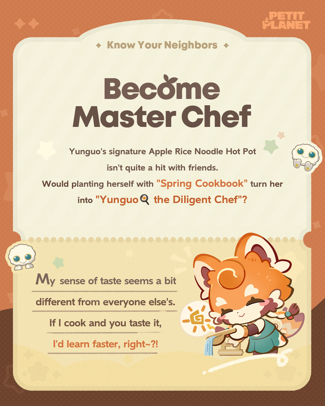 | current | 12:55, 7 April 2026 | 1,080 × 1,350 (1.14 MB) | Foxtronaute (talk | contribs) | {{File |categories = Official Images;Know Your Neighbors |neighbors = Yunguo |caption = Know Your Neighbors - Become Master Chef |slink1 = https://x.com/PetitPlanetGame/status/2041455944744272306?s=20 |slabel1 = Official Petit Planet X (Twitter) |date = 2026-04-07 }} |
