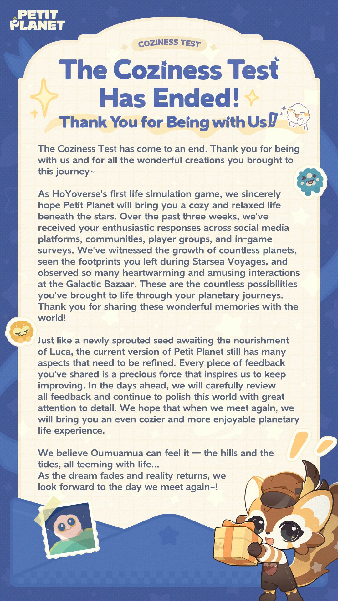 | 15:44, 6 April 2026 | Coziness Test End Notice Text.png (file) | 2.53 MB | {{File |categories = Official Images |caption = Coziness Test End Notice - Text |slink = https://x.com/PetitPlanetGame/status/1995311891636277348 |slabel = Official Petit Planet X (Twitter) |date = 2025-12-01 |neighbors = Glenn }} | 1 | |